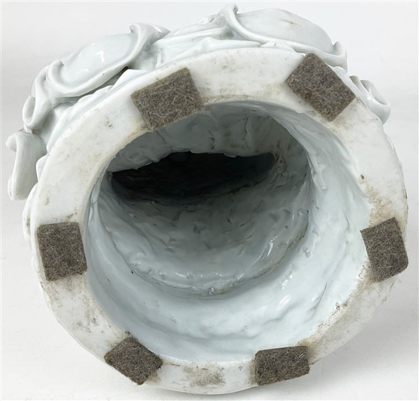 Statuetta in porcellana bianca Dehua raffigurante Guanyin con la perla poggiante su su base a fiore di loto