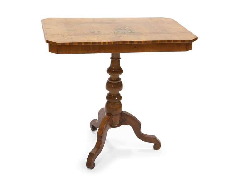 Tavolino rettangolare, Sorrento, II metà XIX sec., lastronato in noce, piano intarsiato a rappresentare due uccellini su un ramo. Piantone centrale poggiante su tre gambe