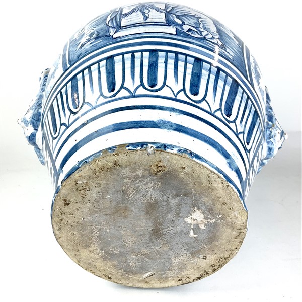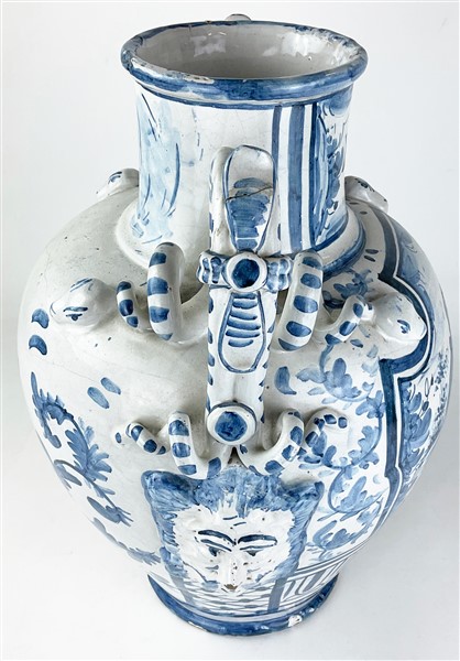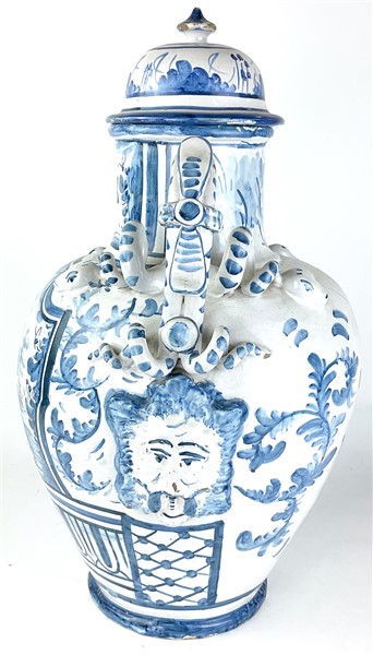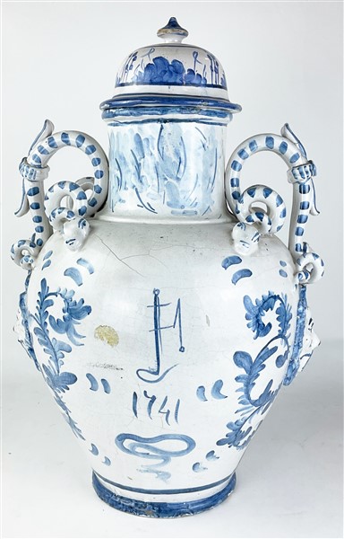 Manifattura ligure, secolo XIX. Orcio con coperchio in maiolica, doppia ansa a serpi con attaccatura a mascherone, decoro in blu con scena allegorica entro riserva. Al retro marca lanterna con data 1741 (h cm 56) (difetti e restauri)