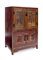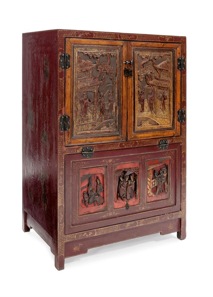 Mobile orientale laccato rosso e scolpito sul fronte con scene di personaggi; sul fronte