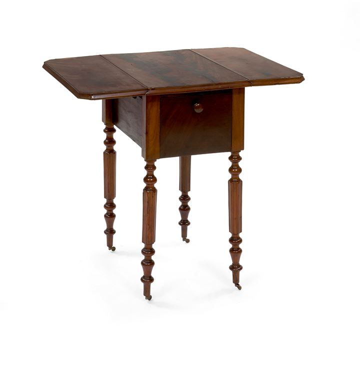 Tavolino a bandelle in mogano e piuma di mogano; Francia, fine XIX secolo, da un lato due tiretti; dall'altro uno sportello. Gambe scanalate