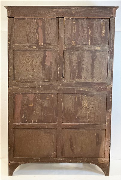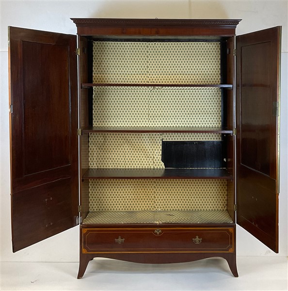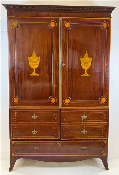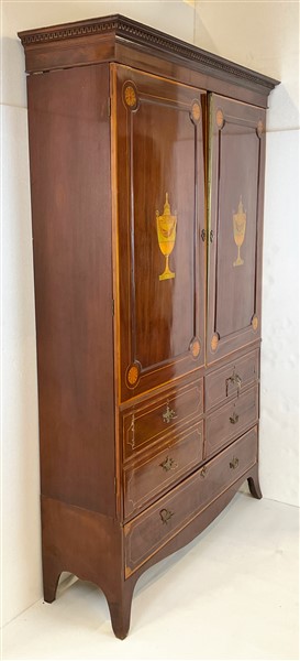 Armadio a due ante ed un cassetto impiallacciato in mogano, filettato ed intarsiato a motivi di vasi classici, cappello aggettante con bordura intagliata a greca. Inghilterra, secolo XIX (cm 140x220x42) (gravi difetti)