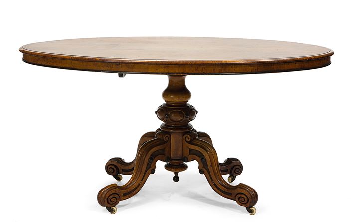 Tavolo di forma ovale in radica di tuia, Inghilterra, seconda metà XIX sec. Piantone centrale con quattro gambe poggianti su rotelle