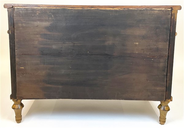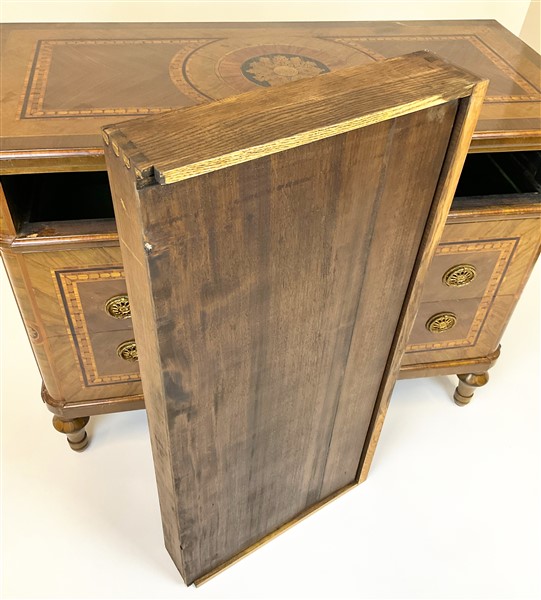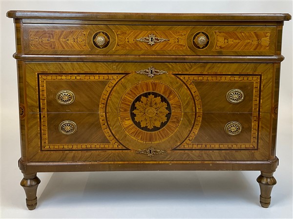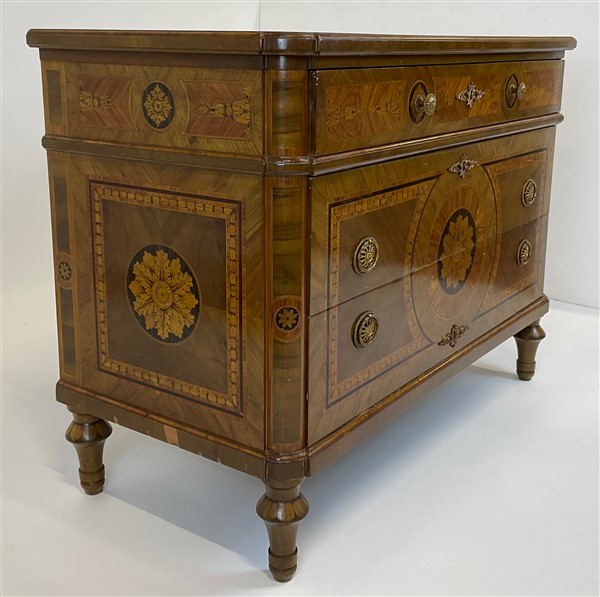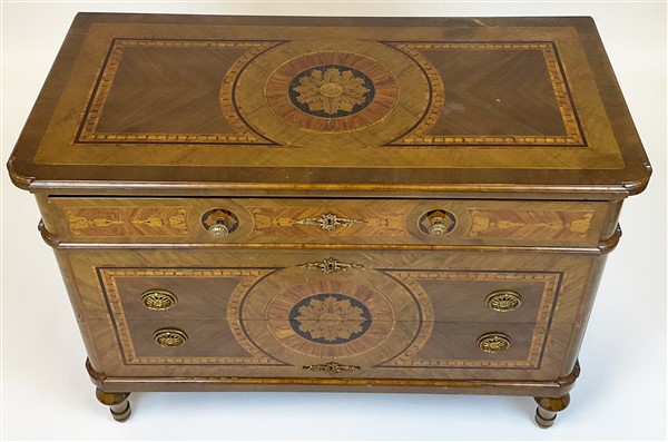Cassettone impiallacciato e intarsiato in legni vari a rosoni entro riserve, fronte a tre cassetti, gambe a balaustro (cm 115x85x55) (difetti)