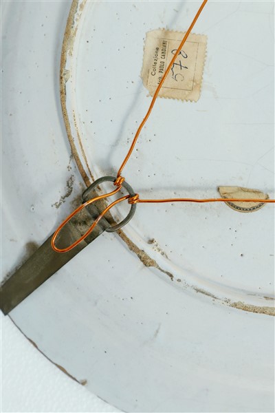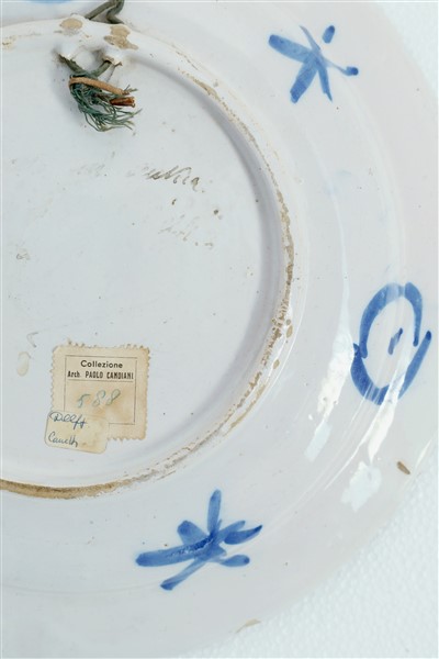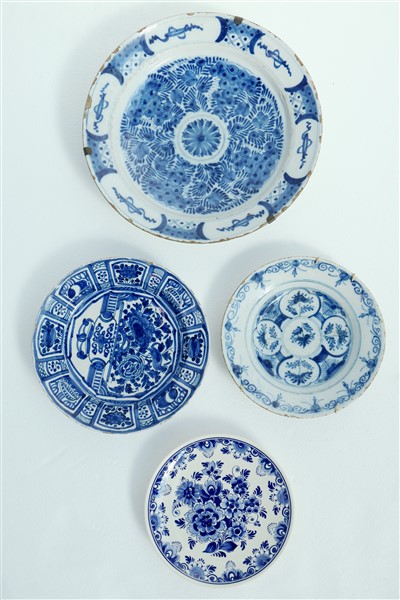 Manifattura di Delft, secolo XVIII. Lotto composto da tre diversi piatti in maiolica decorati in monocromo blu a motivo floreale stilizzato, al retro etichetta di collezione Paolo Candiani; uniti ad un piattino di moderna produzione (d. max cm 34,5) (difetti)