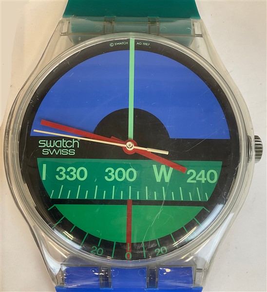 Lotto composto da tre oggetti differenti tra cui un grande orologio da camera Swatch, una sedia e un paio di sci da bambino (difetti)