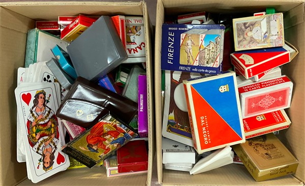 Lotto composto da due cartoni contenenti numerose carte da gioco di diverse epoche e decoro (difetti)