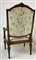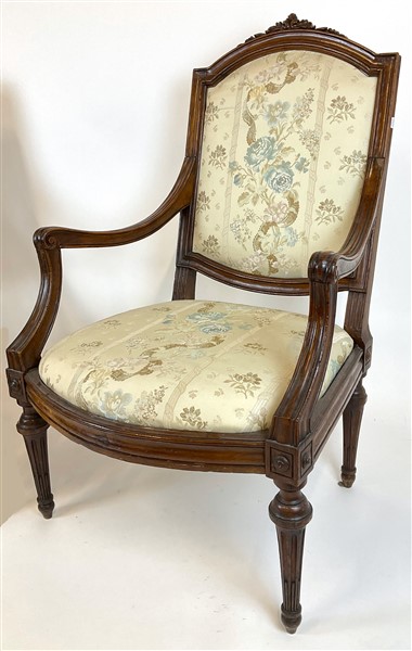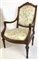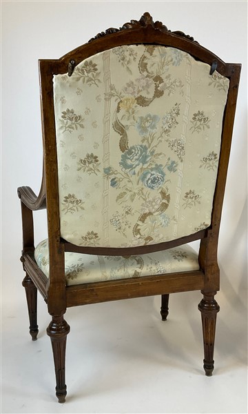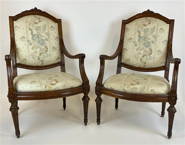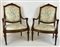 Coppia di poltrone in noce con bordure scanalate e gambe rastremate e scanalate, cimasa intagliata a volute. Seduta e schienale imbottiti. Genova, fine secolo XVIII (difetti)