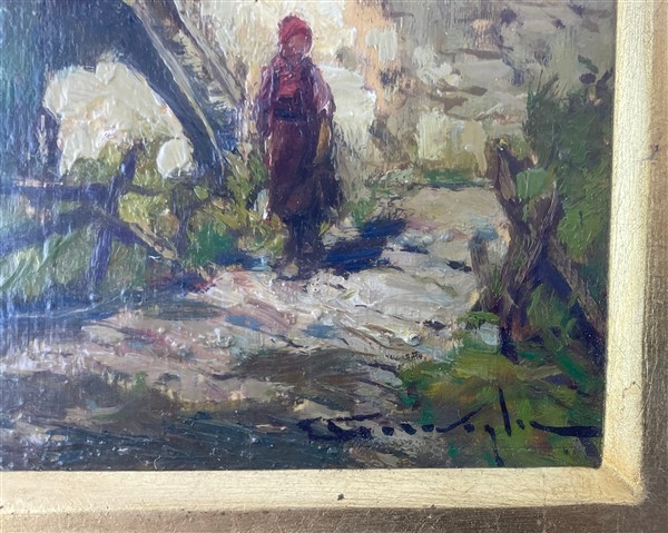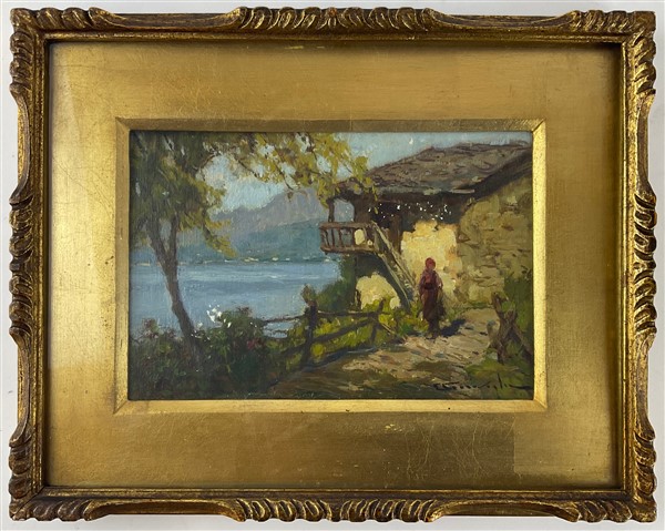 Lotto 852 | Ercole Garavaglia "Scorcio lacustre con contadina" olio su compensato (cm 12,5x