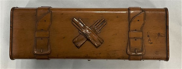 Guantiera in legno intagliato con figura di guanti in rilievo, finte cinture a