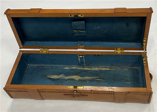 Wooden box, the top carved with a figure of gloves and handles shaped as belts (cm 29x7x10) (major defects)