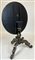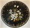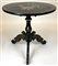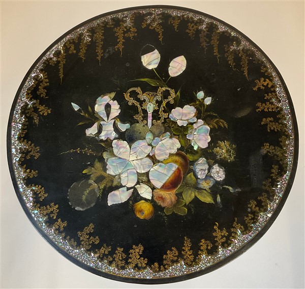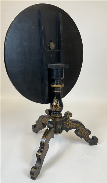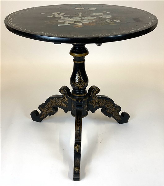 Tavolo a vela in legno ebanizzato e dipinto a motivi di frutti e fiori con inserti in madreperla e decori in oro, sostegno a balaustro su base tripode. Secolo XIX (h. cm 75; d. cm 75) (difetti)