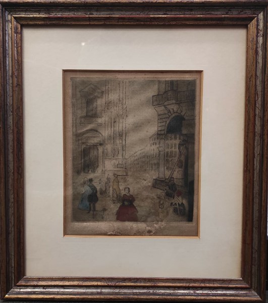 Ignoto del secolo XIX "Vecchia Milano" acquaforte acquerellata (cm 23x19) Rec
