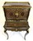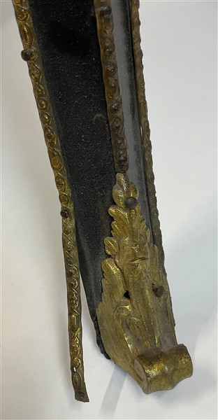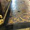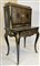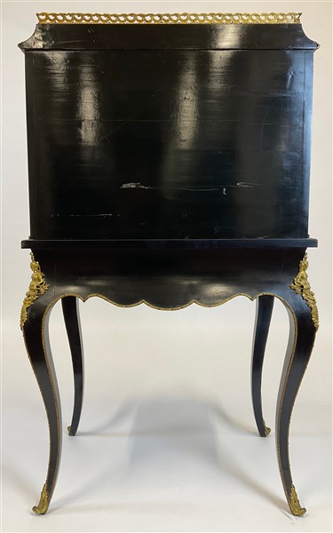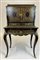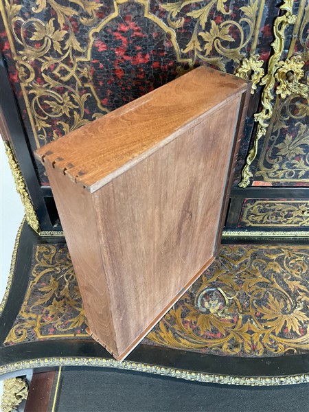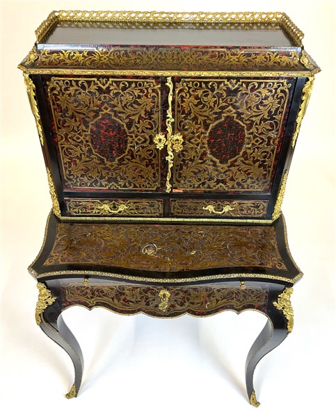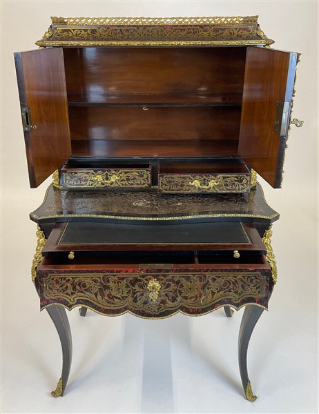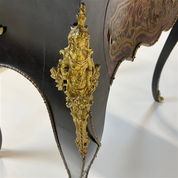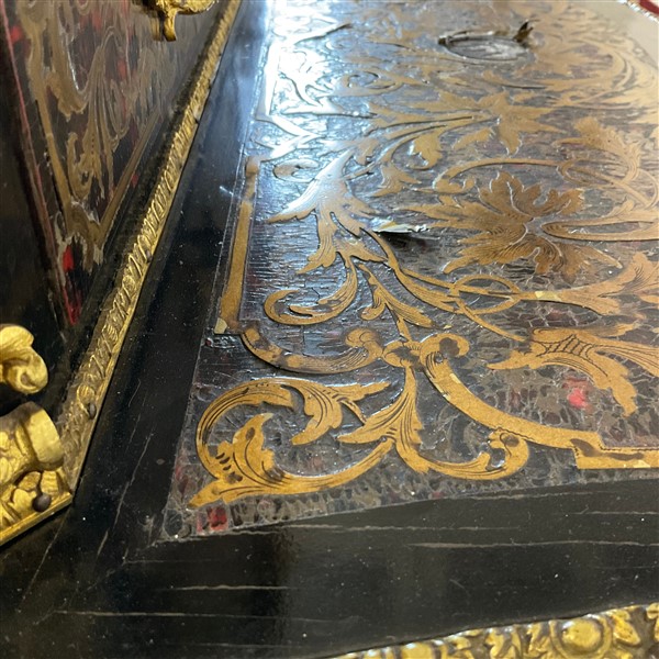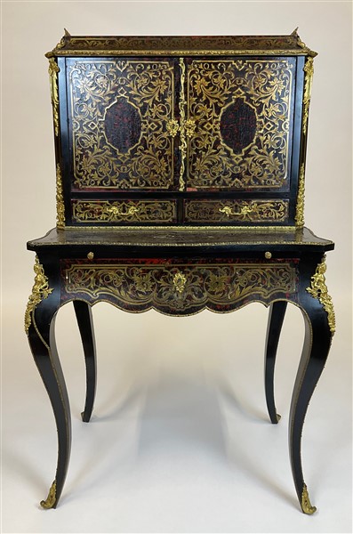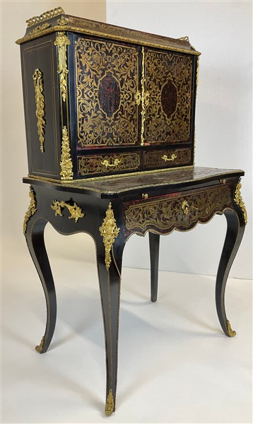 F.lli Levera & Co., Torino, seconda metà secolo XIX. Tavolo scrittoio in legno ebanizzato, filettato e intarsiato nei modi Boulle in ottone su fondo tartaruga a volute floreali. Parte superiore a due ante e due cassettini. Base con pianetto e cassetto segreto estraibile. Profili, montanti e fasce decorate da applicazioni in metallo dorato, gambe mosse. Stampigliatura all'interno di un cassetto (cm 77x128x51) (difetti e mancanze)