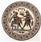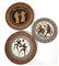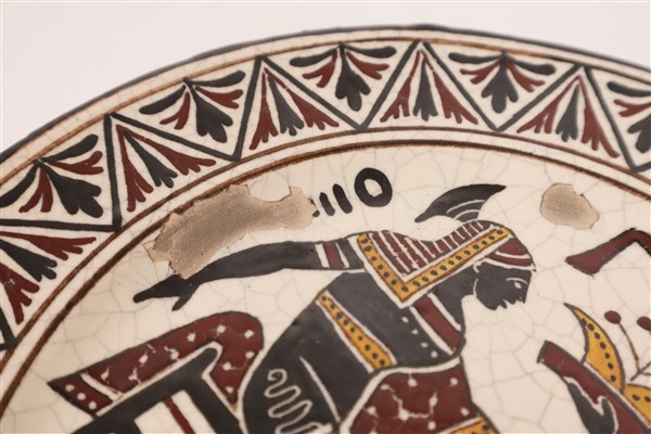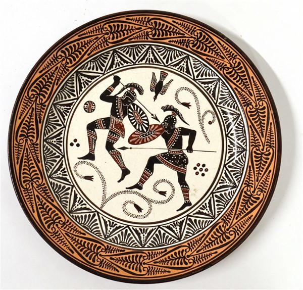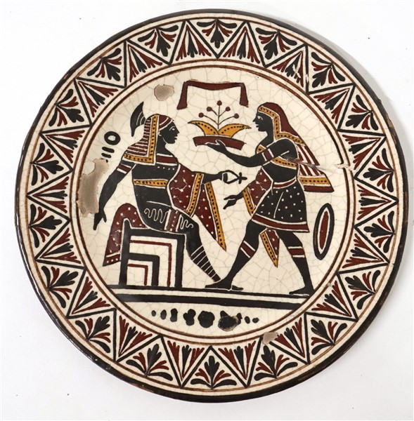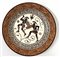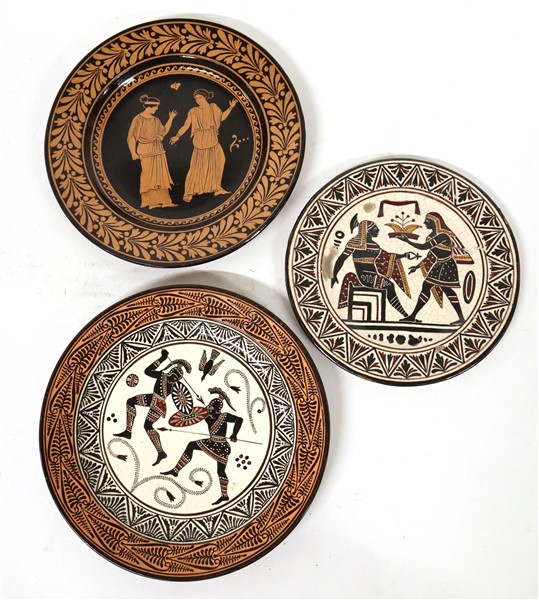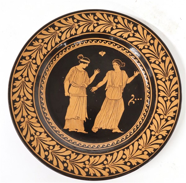 Manifattura Del Vecchio, Napoli, secolo XIX. Piatto in terraglia decorato a figure attiche rosse detto "all'etrusca", marchio impresso (d. cm 24) unito ad un piatto di simile decoro e stessa epoca e ad uno più piccolo di epoca successiva (difetti)