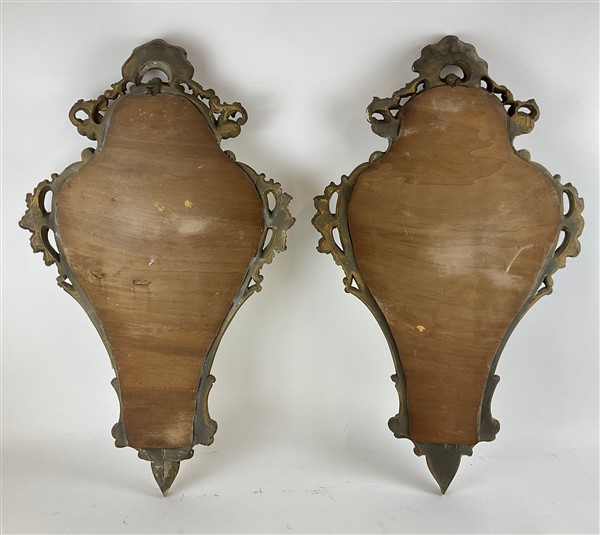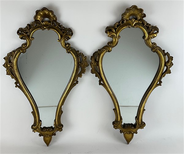 Coppia di specchiere in legno intagliato, traforato e dorato sagomate a volute contrapposte (cm 74x44) (difetti)