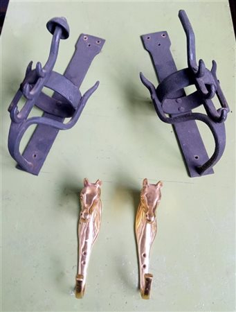 Lotto composto da due appendiabiti in ottone a forma di teste equine e due portaceri in ferro battuto e dipinto (difetti)