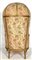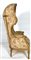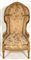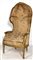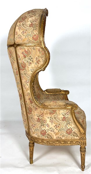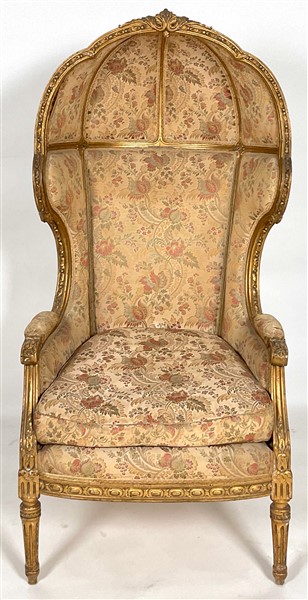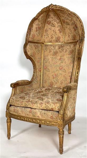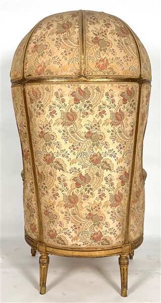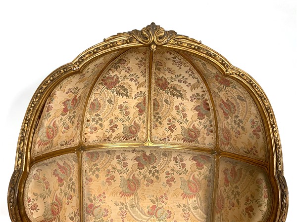 Poltrona in legno intagliato e dorato in stile Luigi XVI modello "fauteuil carrosse" con parasole decorata a volute e motivi concatenati. Gambe scanalate e tessuto decorato a fiori. (difetti)