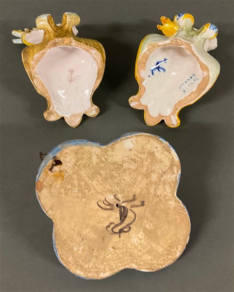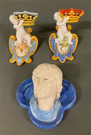 Manifattura Cantagalli, lotto composto da un profilo da Della Robbia e due portalettere con stemmi araldici in maiolica dipinta in policromia (difetti)