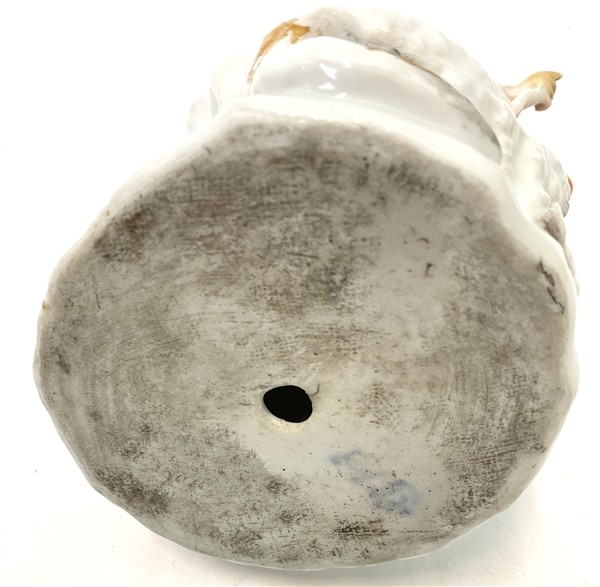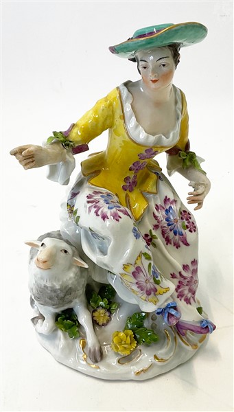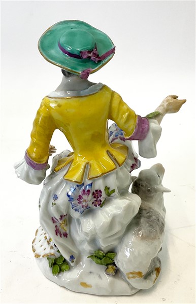 Manifattura di Ludwigsburg, secolo XVIII. Pastorella con pecora su base rocaille, figura in porcellana policroma con profili in oro (h cm 16) (difetti, restauri)