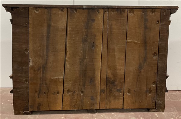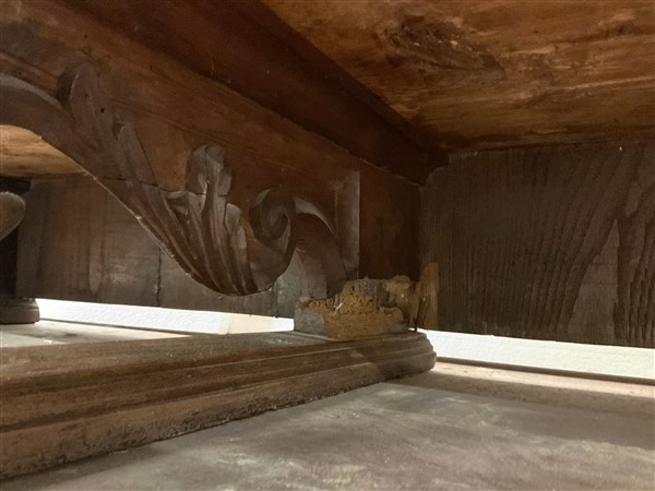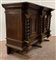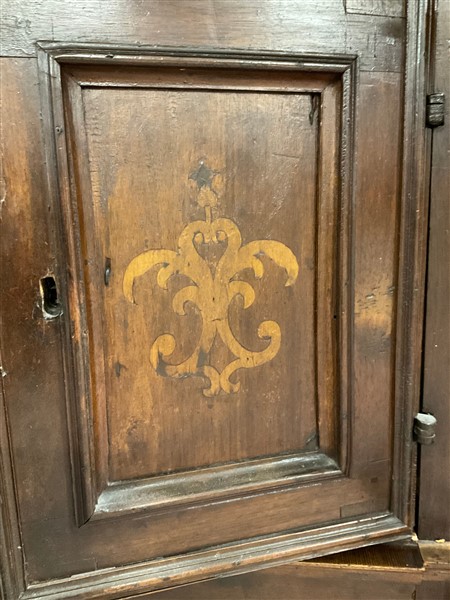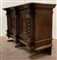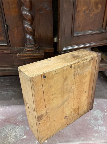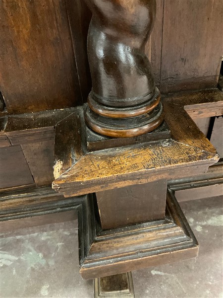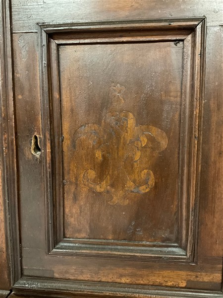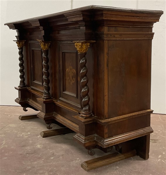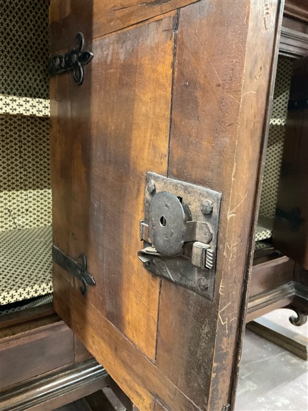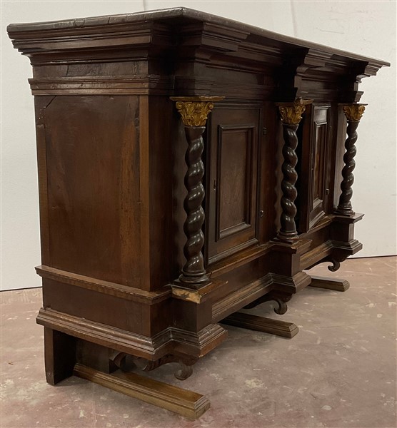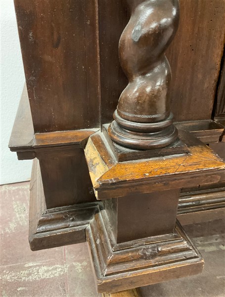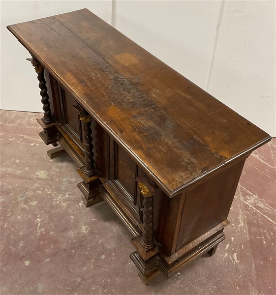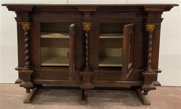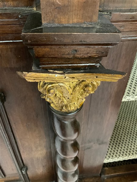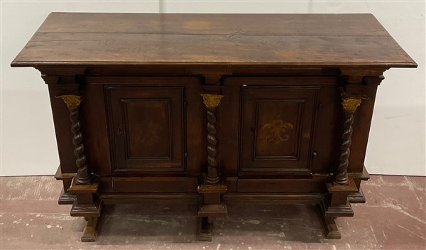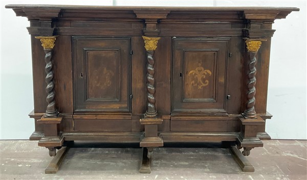 Antica credenza in noce a due ante pannellate e due cassetti. Montanti a colonna tortile con capitello intagliato e dorato. Sostegno di epoca successiva. Probabile alzata di un mobile da sacrestia del secolo XVII (cm 155x99x54) (difetti e restauri)