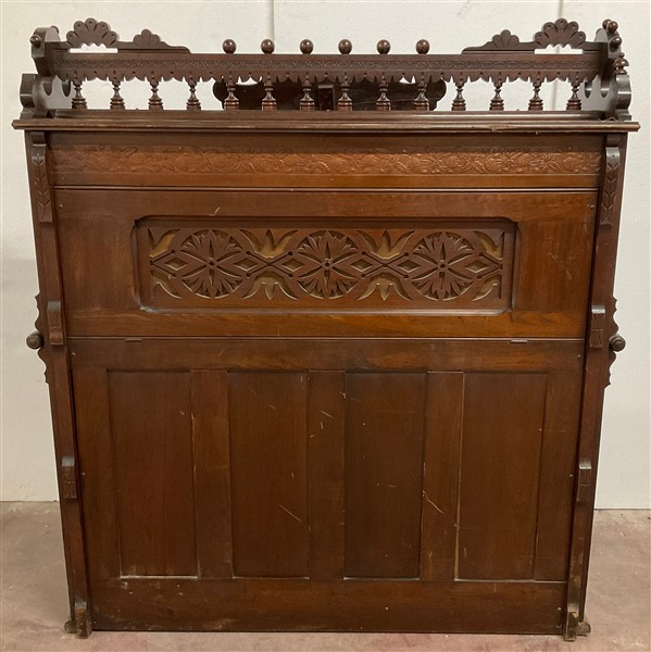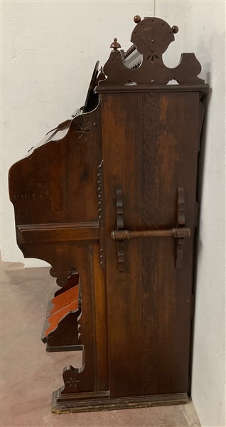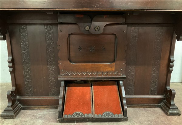 Harmonium in legni vari con pannelli intagliati e traforati (cm 115x130x58) (difetti)