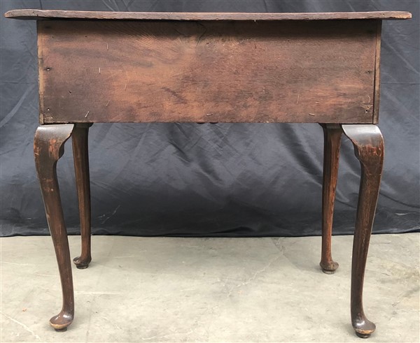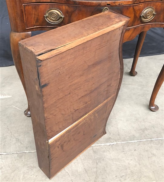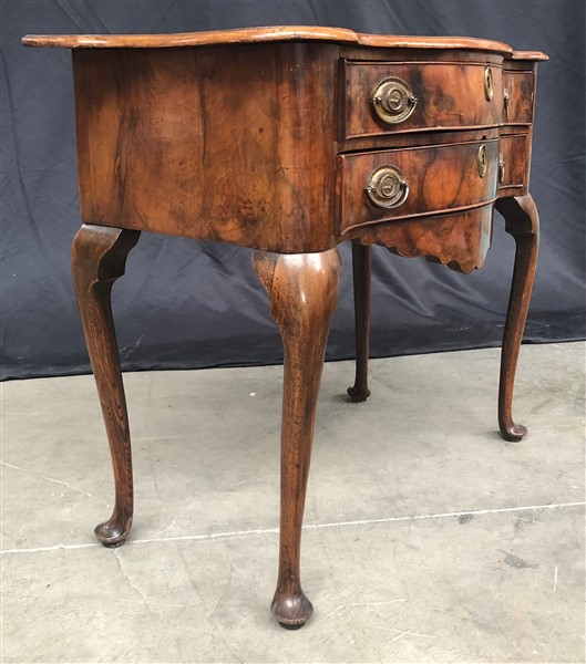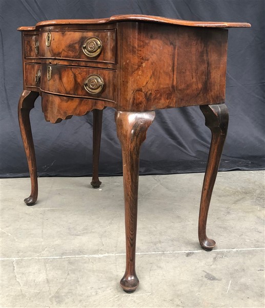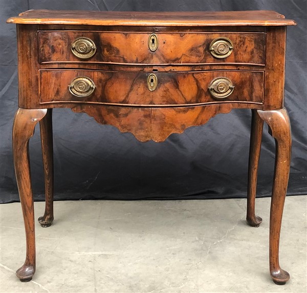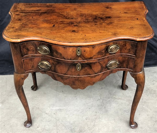 Mobiletto in noce e radica con fronte mosso a due cassetti con grembialina polilobata, piano sagomato e gambe mosse. Olanda, fine secolo XVIII - inizio XIX (cm 78x75x46,5) (difetti e restauri)