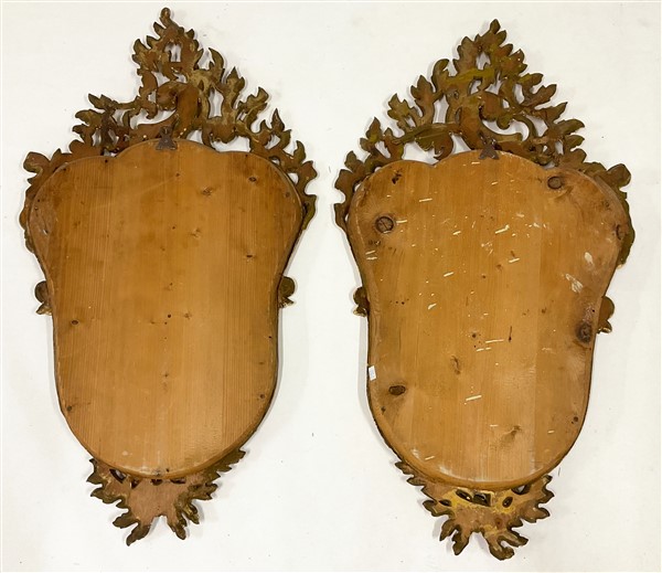 Coppia di specchiere in legno intagliato e dorato di forma sagomata con cimasa traforata a volute rocaille (cm 120x65) (difetti)