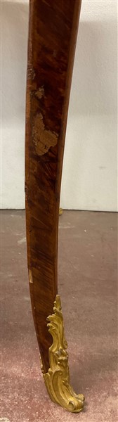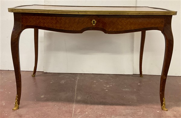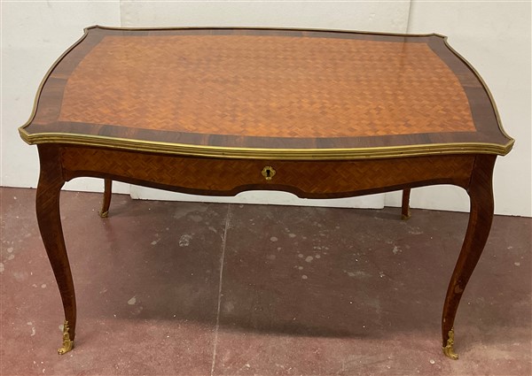 Tavolo scrittoio da centro intarsiato in legni vari a marqueterie. Piano sagomato, un cassetto nella fascia. Scarpette e ciglio in metallo dorato. Inizio sec XX (cm 120x75x76,5) (lievi difetti)