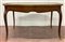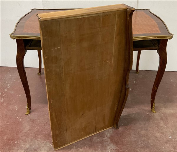 Tavolo scrittoio da centro intarsiato in legni vari a marqueterie. Piano sagoma