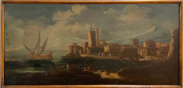 Lotto 1154 | Scuola veneta del secolo XVIII "Marina con velieri e figure" olio su tela (51,5