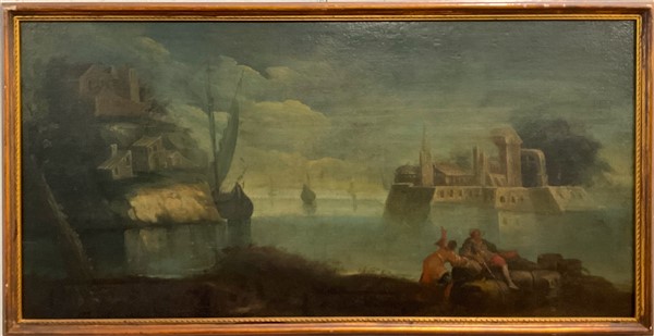 Scuola veneta del secolo XVIII, "Marina con veduta insulare sullo sfondo", olio