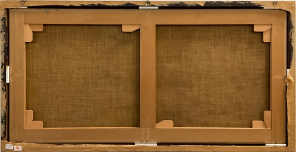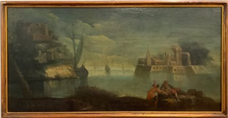 Scuola veneta della fine del secolo XVIII, inizio secolo XIX, "Marina con veduta insulare sullo sfondo", olio su tela (51,5x103 cm), in cornice (difetti)