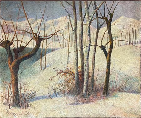 Ignoto lombardo di fine secolo XIX "Bosco innevato" olio su tela (cm 80x95,5)