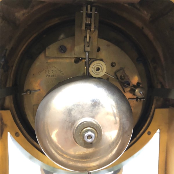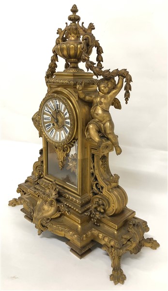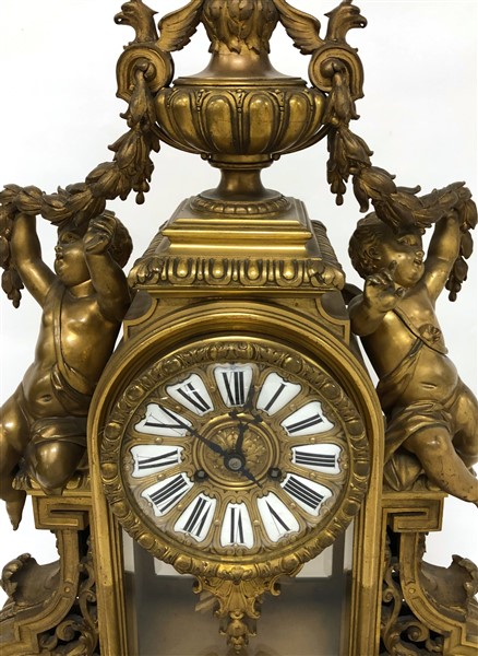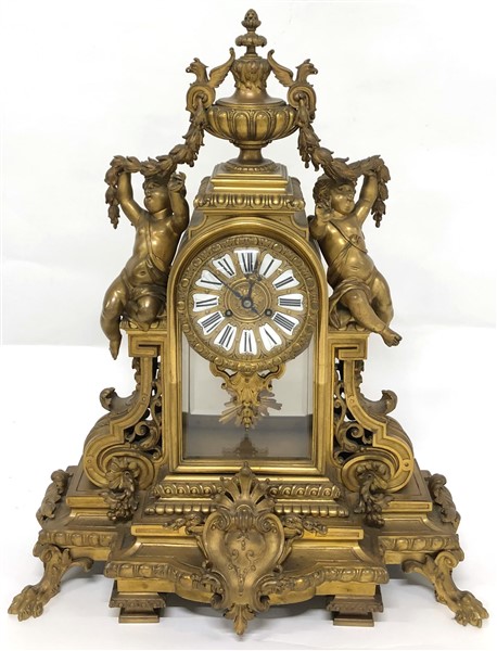 Orologio in bronzo riccamente decorato a soggetto allegorico. Quadrante a carto