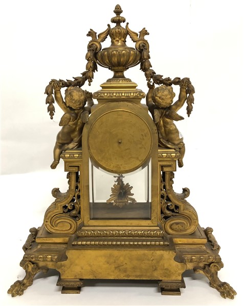 Orologio in bronzo riccamente decorato a soggetto allegorico. Quadrante a cartouches a numeri romani. Movimento a due treni con suoneria delle ore e mezze su campanello. Francia seconda metà del secolo XIX (h. cm 70) (difetti)