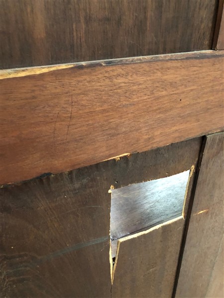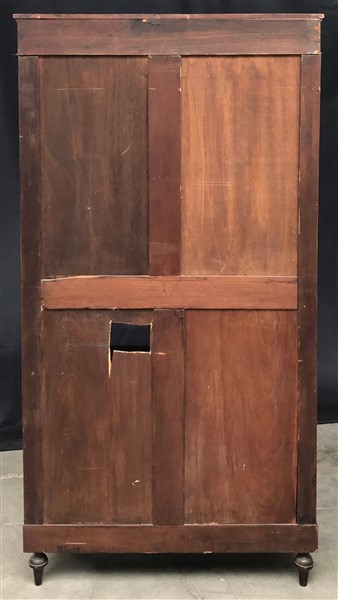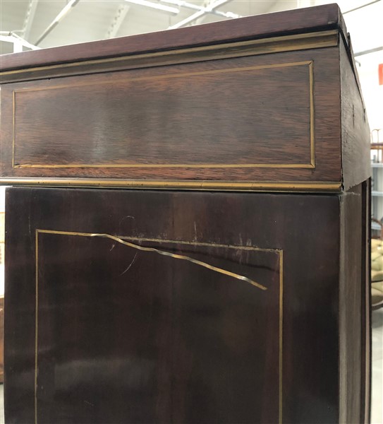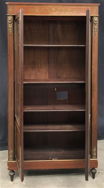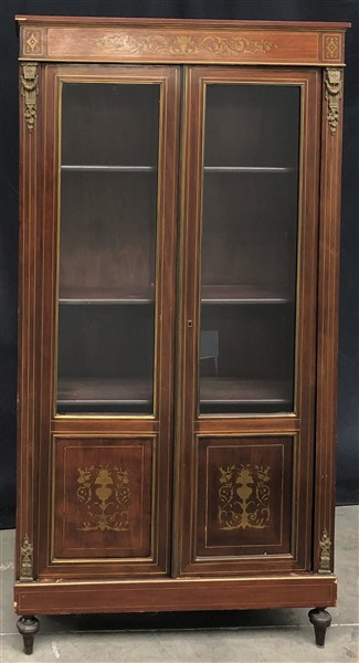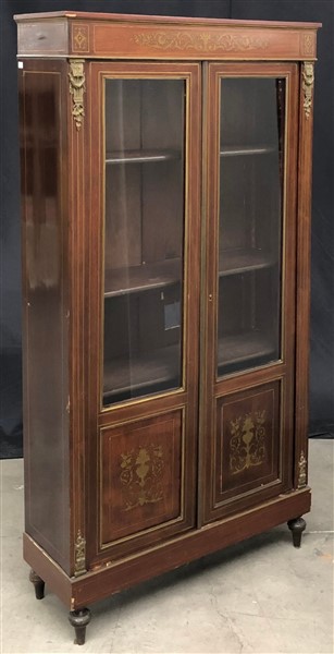Vetrina a due ante impiallaccciata in mogano e legni vari, filettata e intarsiata in ottone a volute. Interno a ripiani (cm 102x195x35) (difetti e rotture)