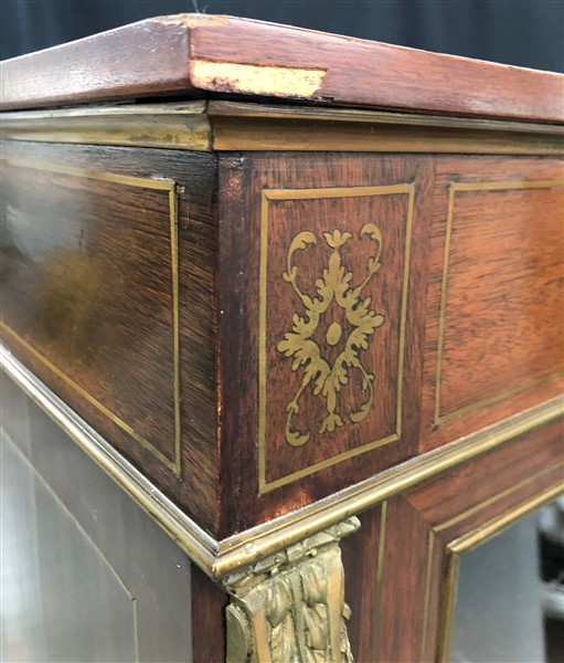 Vetrina a due ante impiallaccciata in mogano, filettata e intarsiata in ottone