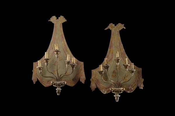 Pair of 18th-century Venetian five-light appliques with molded panel painted in faux drapery (cm 93x62) (defects)