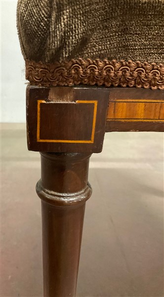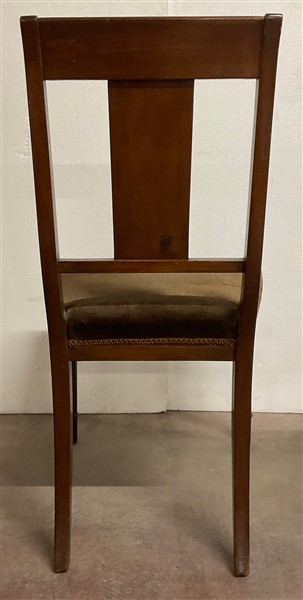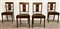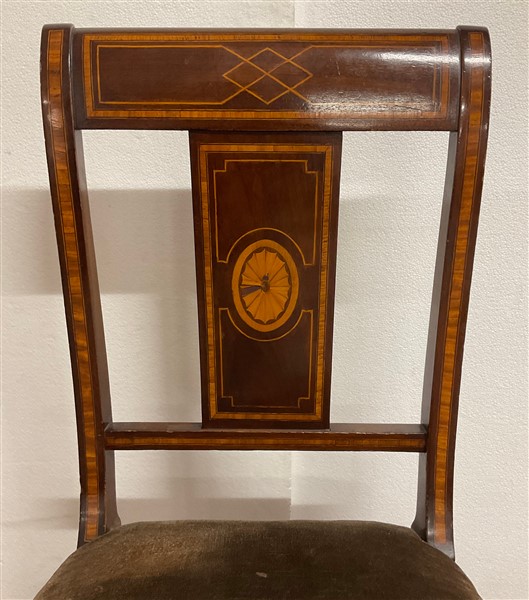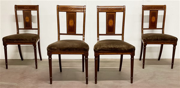 Lotto 1203 | Gruppo di quattro sedie inglesi in mogano intarsiate in legni vari, gambe anter