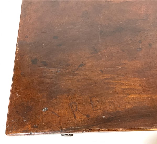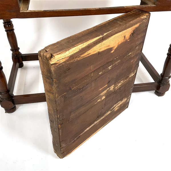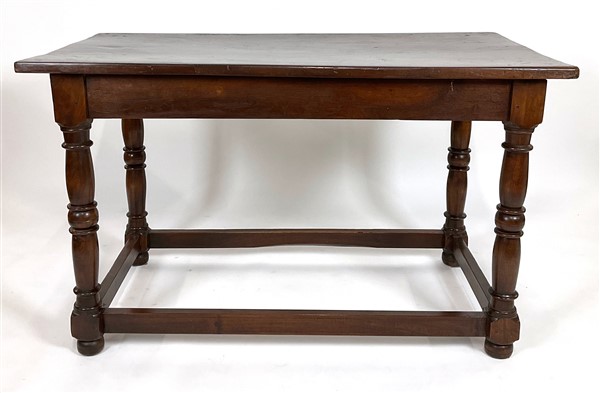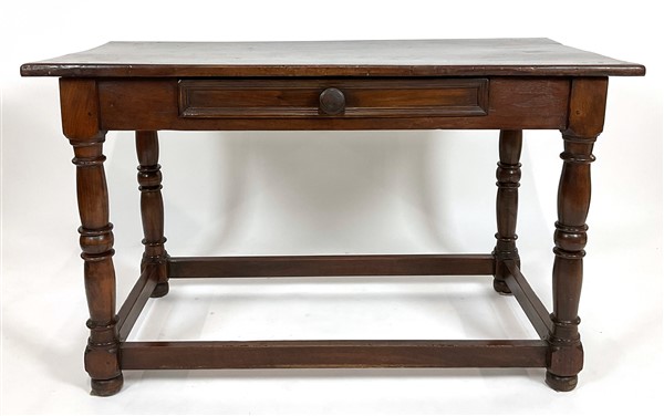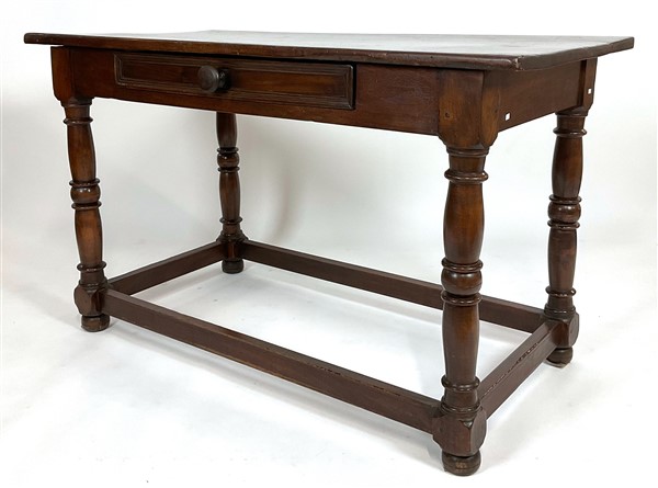 Lotto 1206 | Antico tavolo in noce con cassetto nella fascia, gambe tornite unite da travers