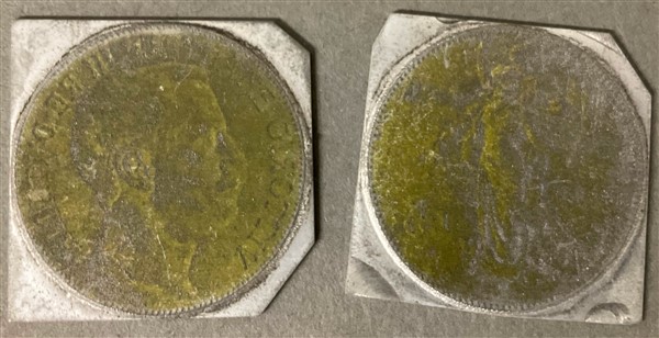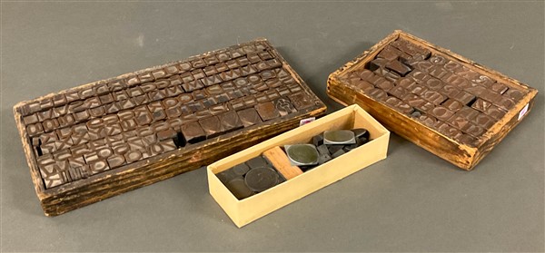 Lotto composto da due scatole contenenti caratteri per stampe unite a una scatola con calchi per monete (difetti)
