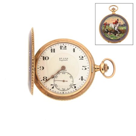 Tripla cassa in oro giallo finemente cesellata sui profili, con particolare scena di caccia in smalti policromi; quadrante in smalto personalizzato con scritta in cirillico, numerazione araba