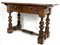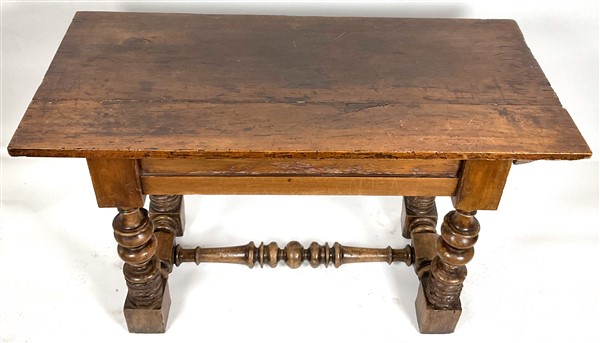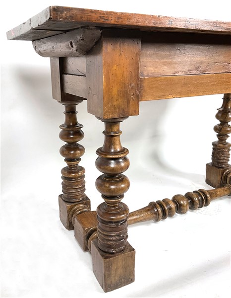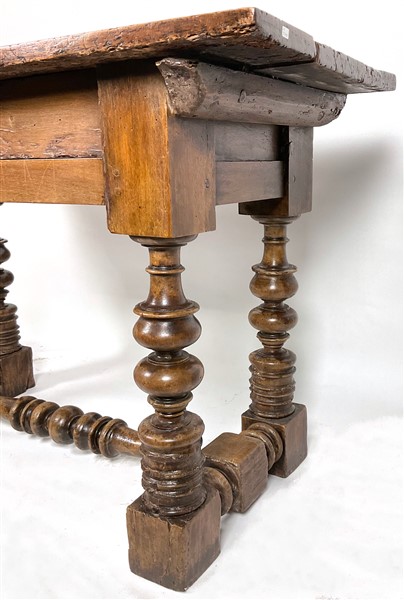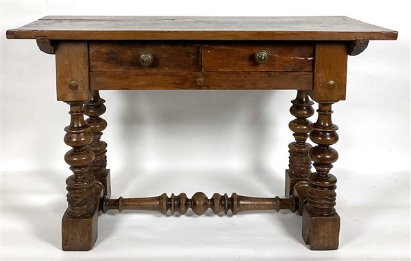 Tavolo in noce e legni vari con fronte a due cassetti allineati, gambe e traversa di raccordo tornita a rocchetto su piedi a plinto. Emilia, secolo XVIII (cm 126x79x57) (difetti e restauri)