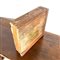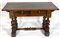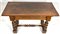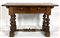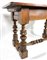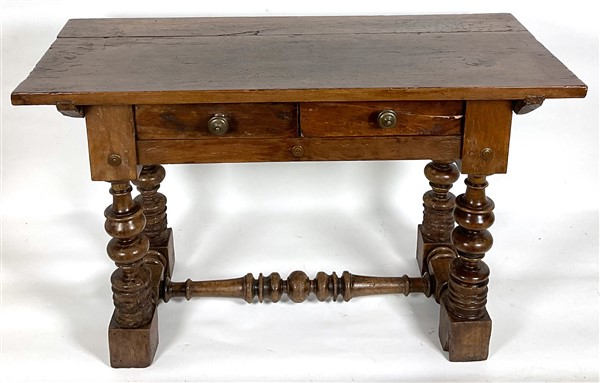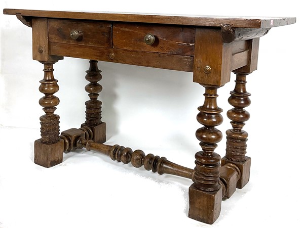 Tavolo in noce e legni vari con fronte a due cassetti allineati, gambe e traver