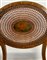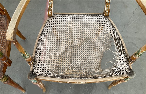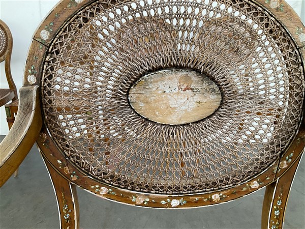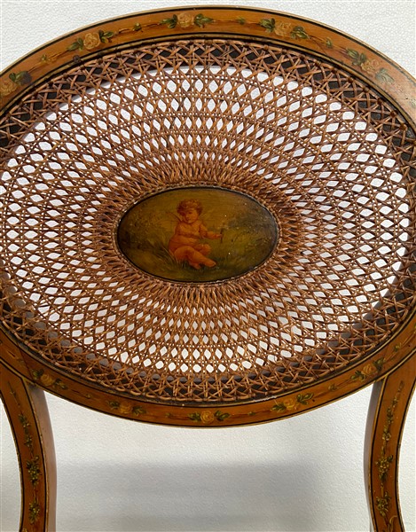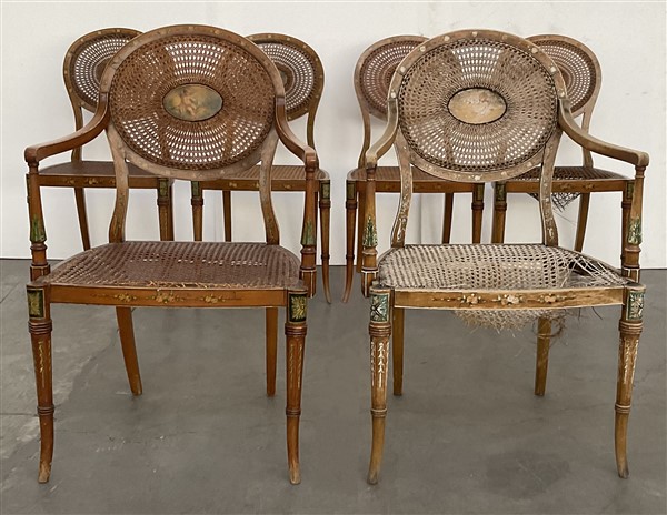 Gruppo di quattro sedie e coppia di poltrone in legno dipinto in policromia nello stile di Thomas Sheraton. Schienali e seduta in paglia di Vienna, medaglioni ovali e bordure decorate da putti, fiori e foglie. Inghilterra, inizio secolo XX (difetti e rotture)