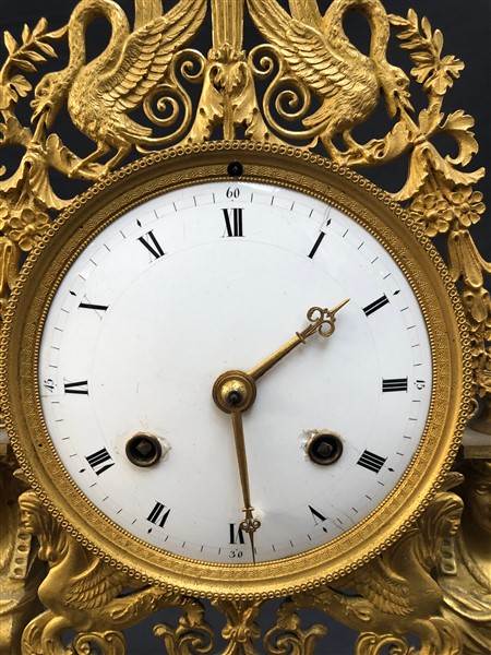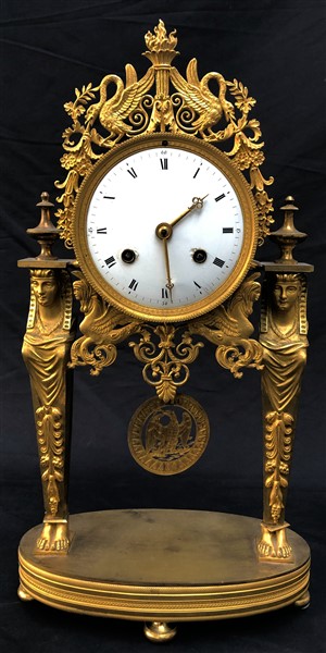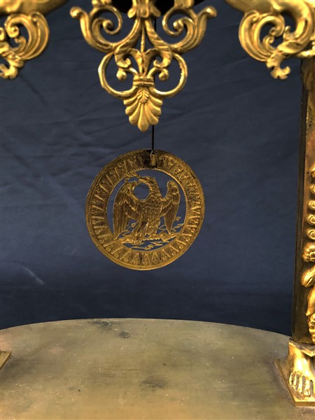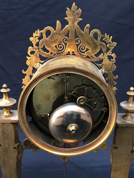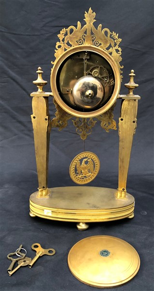 Orologio a portico in bronzo dorato, quadrante bianco a cifre romane, movimento a due treni con suoneria delle ore e mezze. Fine secolo XVIII\inizio secolo XIX (h cm 42) (difetti)
