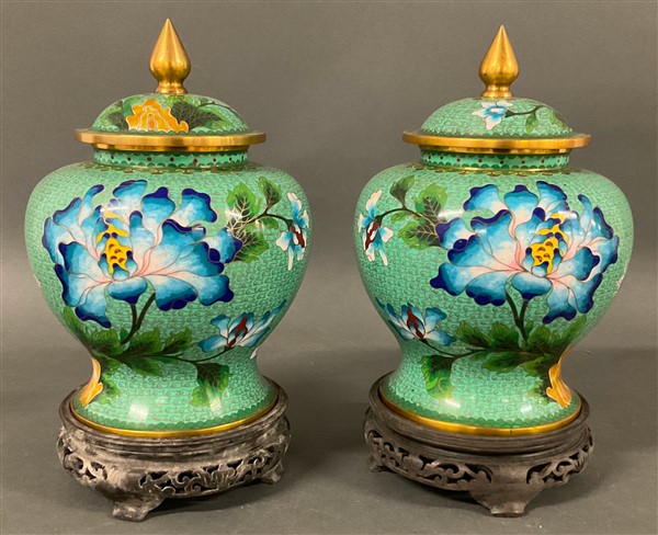 Coppia di vasi con coperchio in smalto cloisonnè con decori di fiori su basi in legno