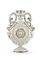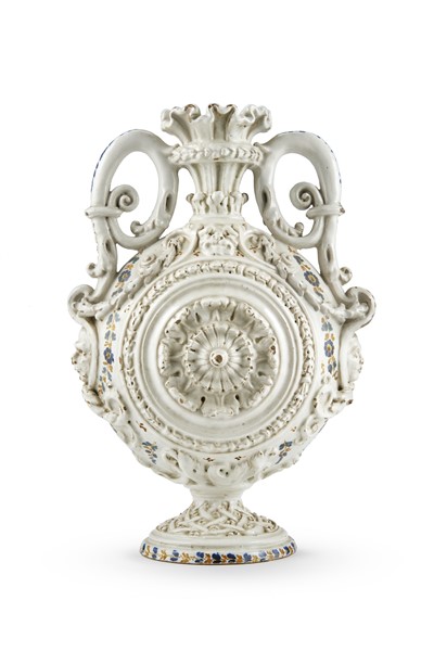 Lotto 1268 | Antico vaso biansato in maiolica bianca, corpo centrato da rosone a rilievo e c
