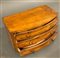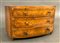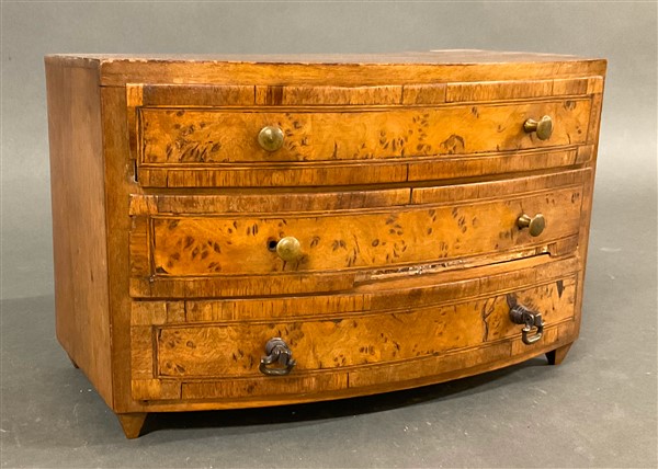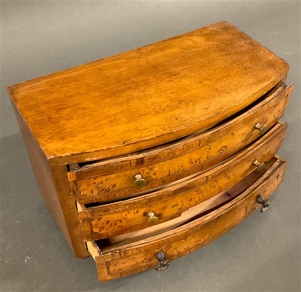 Modello di cassettone con fronte mosso a tre cassetti filettati e radicati in legni vari, piedi sagomati (cm 26,5x16x14) (difetti)